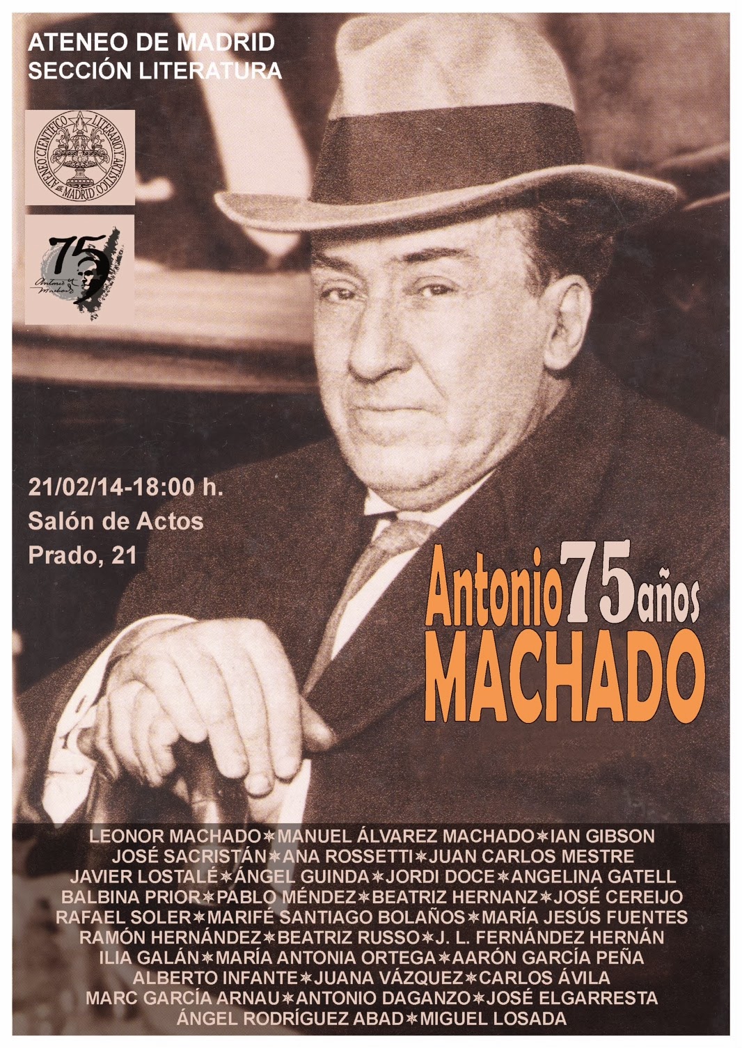 Dentro de unos días cumplirán 75 años del fallecimiento del poeta Antonio Machado. El próximo 21 de febrero a las 18h en el Anteneo de Madrid (Prado, 21) tendrá lugar un homenaje al poeta organizado por Miguel Losada. El homenaje contará con la presencia de su sobrina Leonor Machado. El “retrato” de don Antonio será interpretado por José Sacristán. En el acto intervendrá el hispanista Ian Gibson y los poetas Juan Carlos Mestre, Ana Rossetti, Javier Lostalé Alonso, Angel Guinda, Jordi Duce, Angelina Gatell, Balbina Prior, Pablo Méndez, Beatriz Hernanz Angulo, José Cereijo, Rafael Soler, Marifé Santiago Bolaños, María Jesús Fuentes, Ramón Hernández, Beatriz Russo, J. L. Fernández Hernán, Ilia Galán, María Antonia Ortega, Aarón García Peña, Alberto Infante, Juana Vázquez Marín, Carlos Ávila, Marc García Arnau, Antonio Daganzo, José Elgorresta y Ángel Rodríguez Abad.