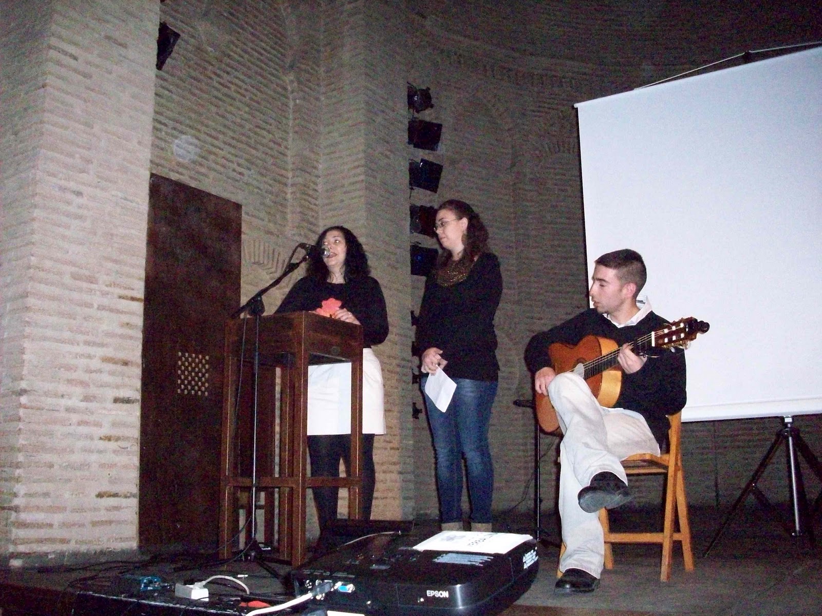 Ruth Rodríguez presentando a Nuria Cogolludo, Concejal de Juventud, antes de su intervención. Junto a ellas, el guitarrista Diego Rodríguez.