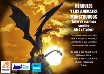 Y si tienes entre 7 y 11 años, te esperamos en el taller “Hércules y los animales monstruosos”. El jueves 26 a las 18.00h estaremos en la Biblioteca Regional de C.LM y el sábado 28 a las 12.00h en la Librería Hojablanca.