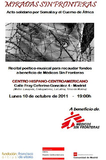“Miradas sin fronteras” es un recital literario y musical que se celebrará para recaudar fondos a beneficio de Médicos Sin Fronteras, y será continuación de otro recital celebrado con anterioridad en Sevilla. Habrá grandes poetas, músicos, cuentacuentos… Seguro que lo pasamos bien, y sobre todo podemos echar una mano. Entre todos hagamos saber a los voluntarios que se juegan la vida en el Cuerno de África que no están solos.