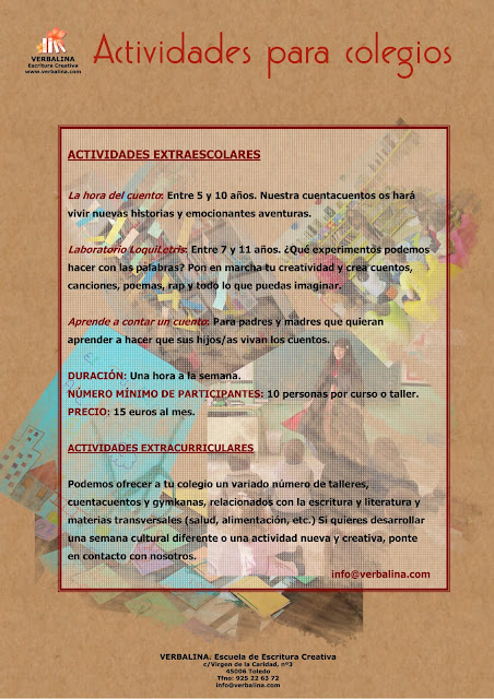 Podemos ofrecer a tu colegio un variado número de talleres, cuentacuentos y gymkanas, relacionados con la escritura y literatura y materias transversales (salud, alimentación, etc.) Si quieres desarrollar una semana cultural diferente o una actividad nueva y creativa, ponte en contacto con nosotros.